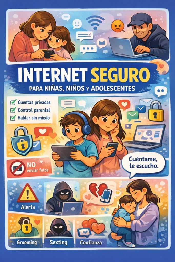 Esta guía busca ayudar a madres y padres a comprender cómo funcionan los riesgos reales en internet y qué acciones concretas pueden tomar para proteger a sus hijas e hijos, sin vigilancia excesiva o castigo.